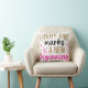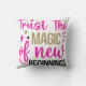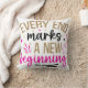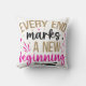 White cushion with caption Every End Marks A New Beginning in black, gold & pink.