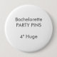 Custom 4" Huge, Very Large, Big Round Bachelorette Party Pin for bride, bridesmaids, mother-of-the-bride names, jokes, fun at the bridal shower, bechelorette night, weekend or party, or wedding to fully personalize. Create your own, make your own, design your own, upload your own photo, design, or use multi font text to customize.