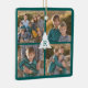 Create your own photo collage with 4 images in a square grid on a teal background. A white Christmas tree silhouette overlaps the corners of the photos in the centre and features your monogram in a green font. Add your initial and photographs in the sidebar to personalize it. Makes a great custom Christmas gift.