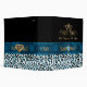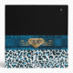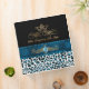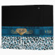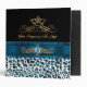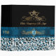 Lovely all purpose Avery binder, with a turquoise, white and black spotted whimsical snow leopard pattern, on the bottom and a solid black, on top. Graphics of a pretty blue satin looking ribbon runs across the middle of the binder and has a gold tone floral flourish and blue jewel, in the middle of the ribbon. Customized for your needs by me.