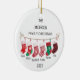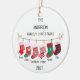 Colorful and cute Christmas Stockings with with your family name and names under each stocking, plus on the back, Christmas and the year(or your own desired message) make this adorable ornament very special. Come back as the stockings change! Use our handy tool to customize the name and message easily. Many more ornaments in the Paws Charming shop, including this design for smaller families, so have a look around! Thanks for looking; we appreciate your business.