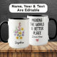 Honour the incredible woman born in April with this elegant custom mug featuring her birth month flowers—Sweet Pea & Blossom. One side displays her name beneath a timeless floral illustration, while the other side reads: “Making the world a better place since [year].”