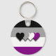 Basic Button Keychain with asexuality pride flag with black, grey, white and purple striped pattern with hearts design