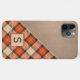 Contemporary tan beige, taupe brown, black, and autumn pumpkin orange coloured tartan plaid, and a faux leather texture pattern background. With room to customize or personalize with a name monogram or initial of your choice. Beautiful, modern, and cool cover for the trend-savvy and art-loving hip trendsetter, artsy motif lover who wants to protect their phone from dust and dirt, wear and tear. This design is available in Apple iPhone 6, 7, and 8 Plus, 10 or X, XR, XS, 11, 12, 13, 14 Mini, 15 Plus, and Pro Max cellphone cases. Show off your style, look fashionable, and feel stylish with a unique design on a mobile device accessory of your choice.