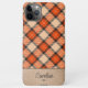 Contemporary tan beige, taupe brown, black, and autumn pumpkin orange coloured tartan plaid, and a faux leather texture pattern background. With room to customize or personalize with a name monogram or initial of your choice. Beautiful, modern, and cool cover for the trend-savvy and art-loving hip trendsetter, artsy motif lover who wants to protect their phone from dust and dirt, wear and tear. This design is available in Apple iPhone 6, 7, and 8 Plus, 10 or X, XR, XS, 11, 12, 13, 14 Mini, 15 Plus, and Pro Max cellphone cases. Show off your personal style, look fashionable and trendy, and feel stylish with a unique design on a mobile device accessory of your choice.