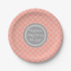 Customizable name it's a girl baby shower party plates in fun and chic peach orange pink, grey and white Moroccan quatrefoil lattice pattern.