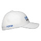 Fits well due to elastic edging, not adjustable. Good qualty material. Good quality embroidering. Subtle lettering (white on beige) just as my wife likes.