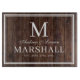 Rustic dark brown wood graphic bbq cutting board with the couples first names, last name monogram, full last name, and wedding date available in customizable templates. A cute farmhouse barbecue themed gift to help celebrate a summer wedding cookout.