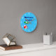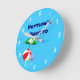 A custom clock with tropical letters and fun art of essential toys for the beach or the pool; a red beach ball, green umbrella, sandals and suntan oil on a blue background with curly waves and optional white numbers. Customize It to change fonts, colours, even save your design for later.