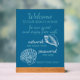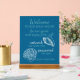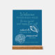 This modern and stylish acrylic pedestal sign features 'Welcome - to our beach house - be our guest and enjoy free wifi - network: - password: - enjoy your stay' in teal blue text against a teal blue green background. It can be personalized or customized with your own message. It's a simple, welcoming method for informing your vacation rental guests about the internet login details.