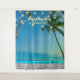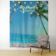 This fun and personalized tropical beach tapestry can be used for a selfie photo booth backdrop and features a tropical beach, turquoise blue ocean, boats, elegant palm trees, string lights, and your event name and date. This backdrop perfect for your tropical homecoming party, beach bridal shower, couple's shower, rehearsal dinner, or wedding reception party, birthday, or graduation party! Easy to customize! Photograph of beach and palm trees taken on the Big Island of Hawaii and design © by TK Goforth.
