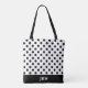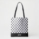 This black-and-white tote bag has a modern polka dot pattern. At the bottom of the bag, there is a black band that you can use to customize the bag with your initials/text.