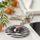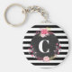 A custom keychain that has a black and white striped pattern. In the centre, there is a monogram logo that can be personalized with your initial. This product makes a great gift for any occasion.