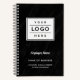 Add a professional look to your workspace with a custom company branded spiral notebook featuring a large space for your business logo with modern custom text that can be personalized with the name of the employee or business owner, business name, location, slogan, website, or other info. Makes a great corporate gift. Includes a faux black Carrera marble background that is printed on the front and back covers.
