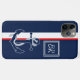 Contemporary dark blue anchor on a blue, white, and red coloured stripes pattern. With room to customize or personalize with a monogram or initials of your choice. This design was created for the boat captain, the sailor, the boater, the water sport, boating, sailing, ocean, summer beach, or sea lover. Beautiful, modern, and cool cover for the trend-savvy and art-loving hip trendsetter, artsy motif lover who wants to protect their phone from dust and dirt, wear and tear. This design is available in Apple iPhone 6, 7, and 8 Plus, 10 or X, XR, XS, 11, 12, 13 Mini, 14, 15 Plus, and Pro Max cellphone cases. Show off your style, look fashionable trendy, and feel stylish with a unique design on a mobile device accessory of your choice.