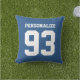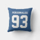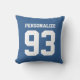 Personalized blue sports jersey number outdoor throw pillow. Customizable background colour. Cute home decor for men women and kids. Create your own garden cushion with school team name or funny quote for baseball, basketball, volleyball, ice hockey, softball, soccer, football etc. Double sided design. Cool gift idea for teen boy or girl, players, fans, coach etc. Custom outside decorations for back yard, patio or terrace. Weather proof decorations.