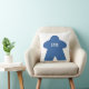 This meeple pillow can be personalized with a name in white font. On one side, there is a large blue meeple with the custom text. On the other side, there is a pattern of small blue meeple to complement the other side. Both sides have a white background.