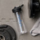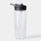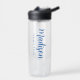 Custom clear water bottle featuring your first name displayed in a bold, blue script with your last name displayed in modern lettering below. The simple, personalized water bottle can also be used to display your organization or business name.