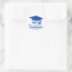 Blue and white graduation sticker uses a masculine font to make it appropriate for a guy or boy. It begins with a graduation cap in two shades of blue. Class of and the graduation year is just below. Then the graduate's name and his high school or college is below. The grad's name is written in two blue fonts. The first name is in a modern script font.. Easy to change the text including the graduation year.