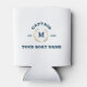 Custom modern vintage boat can cooler with cool navy blue nautical lettering reading CAPTAIN, your monogram in a printed golden laurel, and your personalized boat name. Great gift for a boating trip, your own sailboat, yacht, or boat crew.