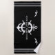 Nautical boating beach towel reading your custom boat name surrounded by a ship's well and anchor in modern black and white with seagulls.