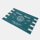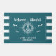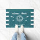 Welcome aboard! Nautical boating doormat reading your custom boat name surrounded by a compass with an anchor on modern teal stripes with seagulls as well as a second line of text ready to be personalized.