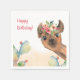 A watercolor illustration of a llama decorates these personalized birthday party napkins.