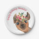 A watercolor illustration of a llama decorates these personalized birthday party plates.
