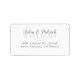 Your address personalized in a easy way... in a white label with two lines of text aligned by centre, and with bride and groom names and family name written in stylish grey font styles