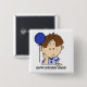 A little brown haired boy with a blue balloon and blue shirt on a button you can customize with your choice of text, his name, and age! Perfect for all who are attending the birthday party!