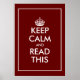 Custom burgundy red keep calm meme wall poster. Create your own funny keep calm and carry on quote. Cool wall decor for bedroom, office, pub, bar, cafe, restaurant, dorm, man-cave, shop, store etc. Modern typography template with crown and stylish border. Colours can be changed. Trendy decorations for fun and laughs.