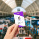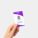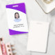 Clean custom employee badge with photo and text in modern curved standard presentation in violet,indigo,purple colors