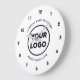 Replace the sample company logo and text with your own in the sidebar to create a stylish minimal wall clock for your business with a simple white background. Your logo can be in color or black and white. Bold black numbers around the edge make it easy to tell the time. Your text curves around the top and bottom of your logo. Click to customize further if you need to adjust the size of your logo with the scale buttons or to change the text color.