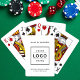 Custom branded playing card set features your logo design centred on the front and framed by custom text that can be personalized with the name of the business, location, slogan, website, or other info. White background and black text colours can be modified.