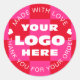 A custom branded sticker features your professional business logo design ready for you to personalize and the words Made with Love and Thank You For Your Order around it. Add your company logo to the placeholder image space. Modern trendy pink and red chequered pattern