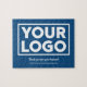 Branded jigsaw puzzle features your company logo, customizable "Thank you for your business!" in white script text, and "Visit us at [yourwebsitename.com]" in a white sans serif font on a blue background. Replace the sample logo and two lines of custom text with your own in the sidebar. Your logo can be a rectangle, circle, square, or any shape. White or light logos will work best for this design. If you want the background colour to show through, upload a version of your logo with a transparent background.