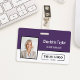 This vertical badge design features a clean, modern two-tone layout with a bold top panel of rich deep purple over a crisp white base. The design emphasizes a strong brand presence, clearly featuring the employee's name and role against the dark color. Below, a large, dedicated space on the white panel allows your company logo to stand out prominently for easy recognition.