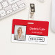 This horizontal ID badge design makes a vibrant, high-energy statement with a bold color block of bright red and crisp white. The layout strategically features the employee's photo on the left, which is perfectly balanced by the name and title clearly displayed in white against the red background. With a prominent space for your company logo on the white panel, this modern style ensures high visibility and immediate recognition.