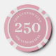Personalized poker game chips with a custom business logo and your own text. This design in pink includes the number 250 but it can be edited with any value amount.