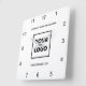 Create your own minimal square wall clock for your business featuring your logo and text on a white background with simple black numbers around the edge. Replace the sample company logo and text with your own in the sidebar. Your logo can be a circle, square, or another shape, and in colour or black and white. Click to customize further if you need to adjust the size of your logo with the scale buttons.