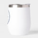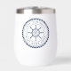 Thermal tumbler featuring a dark blue, elegant ship's wheel and rope emblem with your custom captain's name and boat name on a white background.