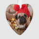 Customize this sweet heart-shaped ornament with two treasured photos of your furry friend. Your custom captions appear on the front and back in white hand lettered style brush typography. Shown with pet's name and the year.