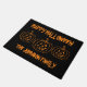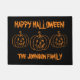 Custom carved pumpkin head Halloween door mat. Fun doormats with personalized family name / surname for this Holiday. Fun party supplies, accessories and decorations with your own funny quote or saying. Make your own custom entry rug for trick or treat night. Add your own welcome message, family name, monogram, surname or quotation. Cute home decor gift idea for the house of office. Personalizable jack o lantern doormat sign template. Create your own jackolantern print entry mat / rug for front door / entryway or hall / party venue, porch, garden etc. Customizable outdoor home decor / decorations for your house or business office, shop, store etc. Available in small and big large size. Pumpkin face carvings with scary typograpghy font in black and orange colour. Happy Halloween!