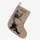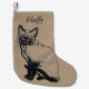 Beautiful arty cat Christmas stocking - customize it! stocking has red back side and red ribbon to hang. Black drawing of a Siamese cat on the front with room to add your cat's name.