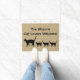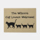 "Cat Lovers Welcome" A custom door mat in light brown with a cat lovers theme showing the silhouettes of a mother cat with her kittens. There is a template area to personalize with your name and text.