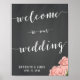 Custom chalkboard wedding reception sign print with pink flowers and customizable text - you can add bride's and groom's name and wedding date. Dimensions of the sign print (poster) are 11 inches by 14 inches.