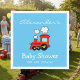 Personalized baby shower napkins with cute red choo choo train. Colourful toy locomotive design with date of birth or celebration. Adorable kids vehicle illustration. Create your own fancy babyshower napkins with customizable text. In pastel light pink purple yellow blue grey etc. Cute idea for new mom, mother to be. Also fun for childrens 1st Birthday party.