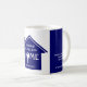 A stylish blue NEW HOME coffee mug with Christian Scripture verse, designed as a realtor-to-client closing gift but can be customized as a gift to new homeowners. ALL TEXT IS FULLY CUSTOMIZABLE so you can personalize the wording to suit your real estate agent corporate branding or personal needs. The text reads BLESSINGS ON YOUR NEW HOME with Joshua 24:15 Bible verse - As for me and my house, we will serve the Lord. The image shows a BLUE house with white typography. The O of HOME is replaced with a key. At the bottom right, you can add your name and company name, and your contact details. This will appear on the right hand side. On the left, you can also add a message of Congratulations and/or greeting to the new homeowner. Matching items available so you can create awesome corporate gift sets for your clients or friends. Other colours available.