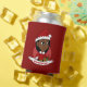 Can cooler with an illustration of a cute smiling happy black girl with long hair, she is wearing red and white Santa Claus costume and holding a present; with editable text template for your name or message, Christmas holidays design with a red background