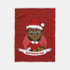 Throw blanket with an illustration of a cute smiling happy black girl with short hair, she is wearing red and white Santa Claus costume and holding a present; with editable text template for your name or message, Christmas holidays design with a red background
